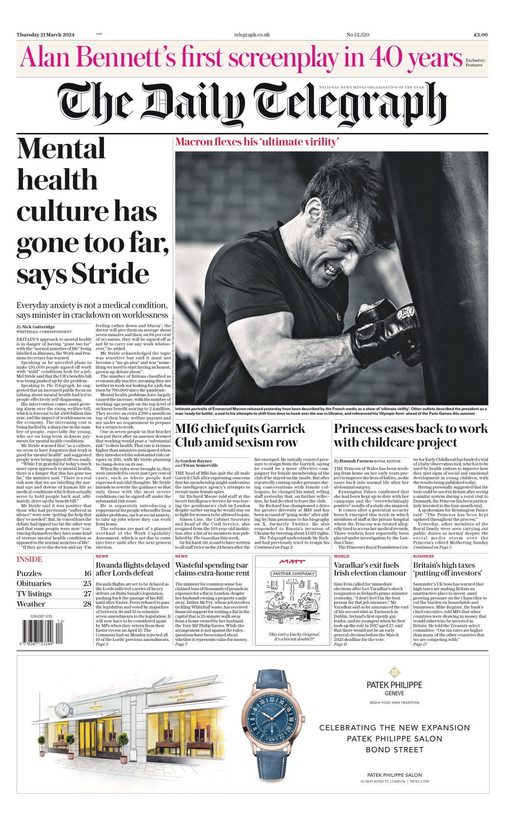 The Daily Telegraph reports on the work and pensions secretary’s claim that mental health treatment in the UK has been overly extended.