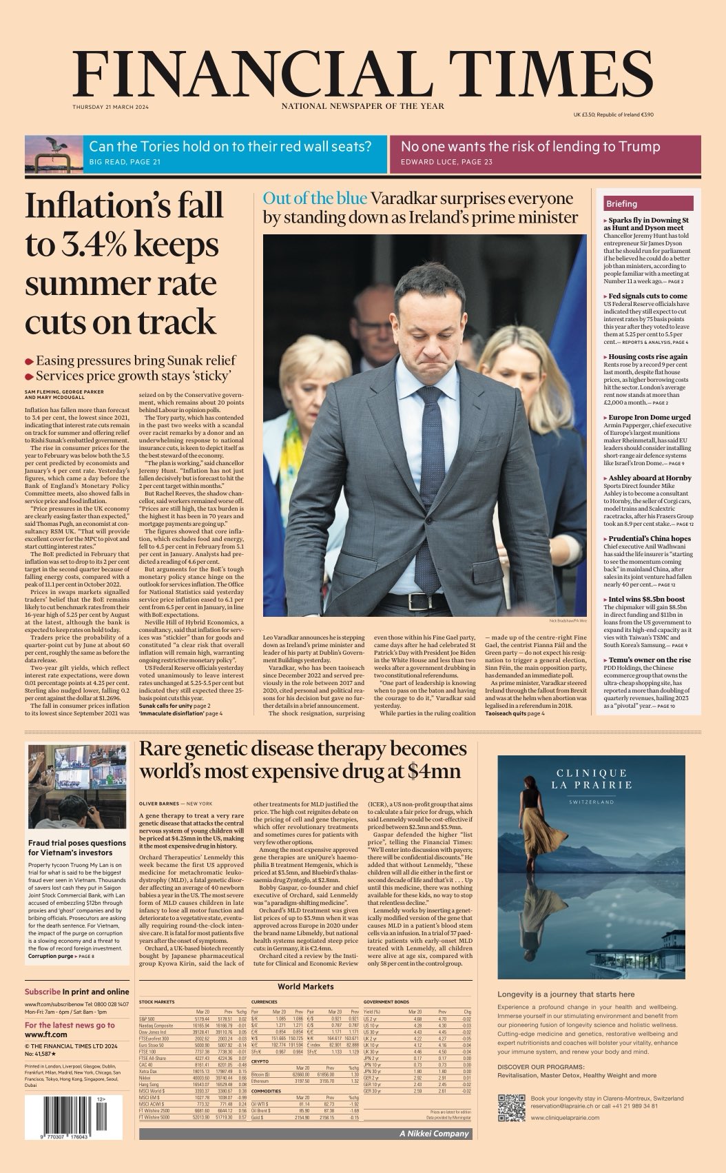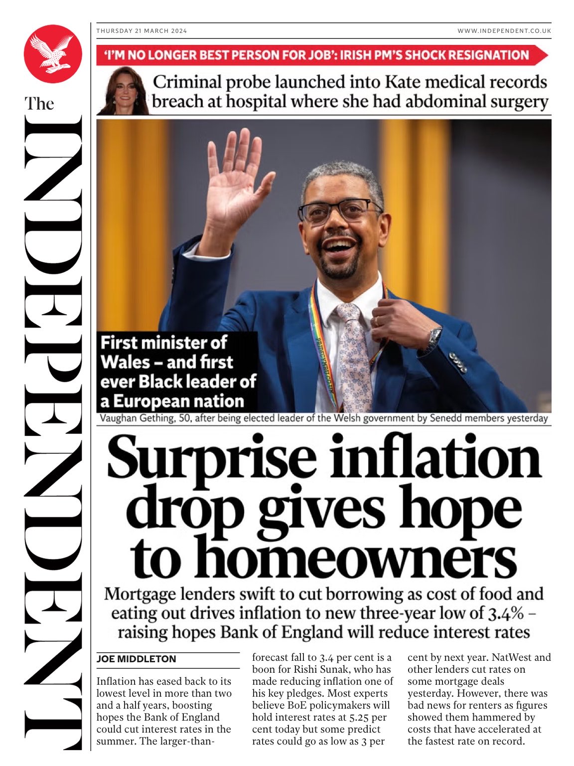 The Financial Times reports a potential interest rate cut following a decrease in inflation to 3.