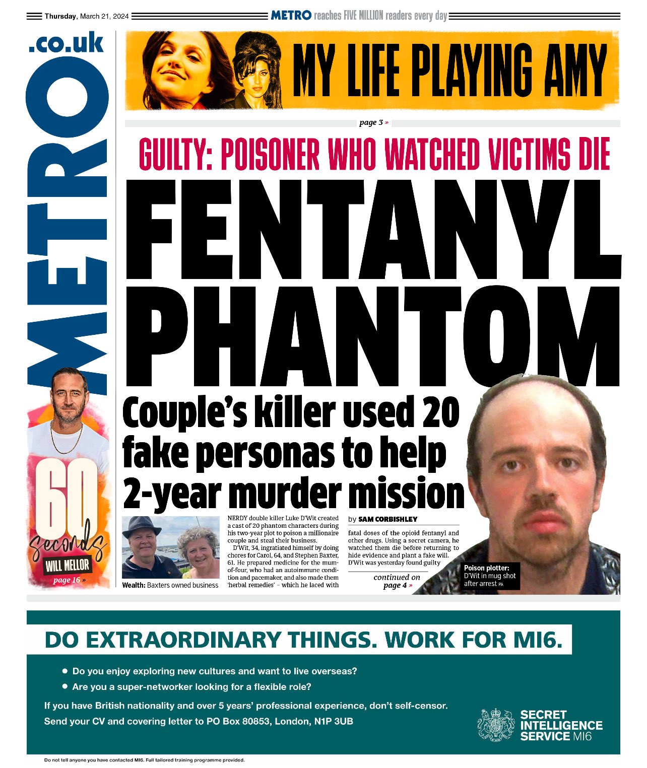 The Metro paper covers a story of a convicted murderer who used fentanyl to kill a millionaire couple for their business.