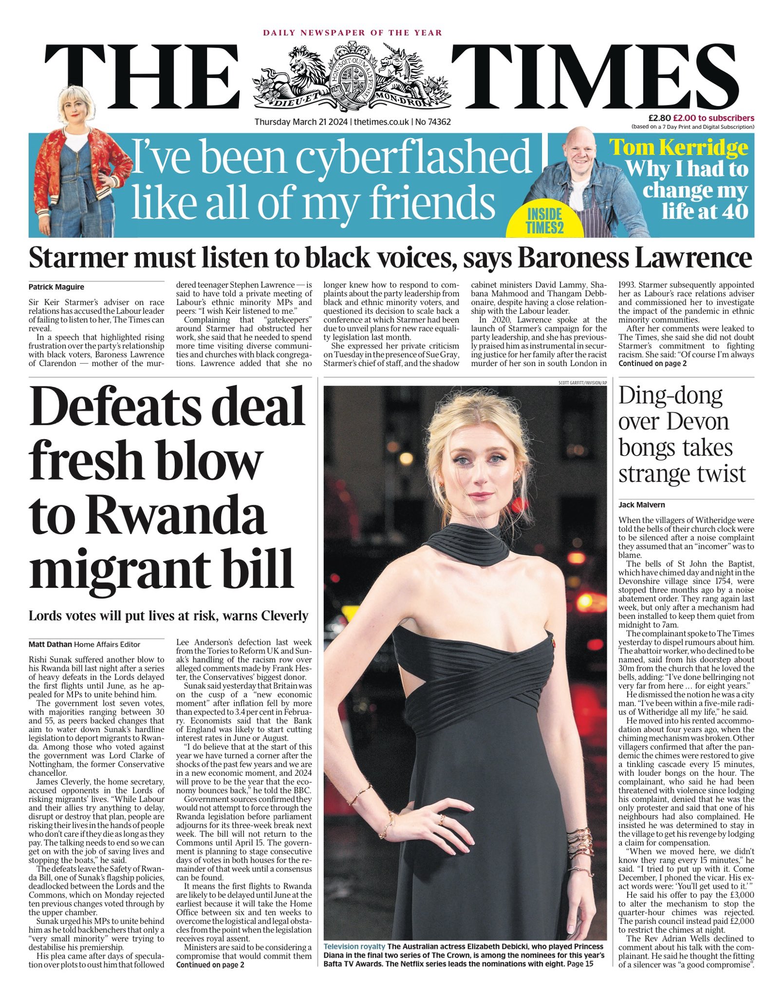 The Times highlights a string of losses for the government’s policy on Rwandan migrants in the House of Lords.