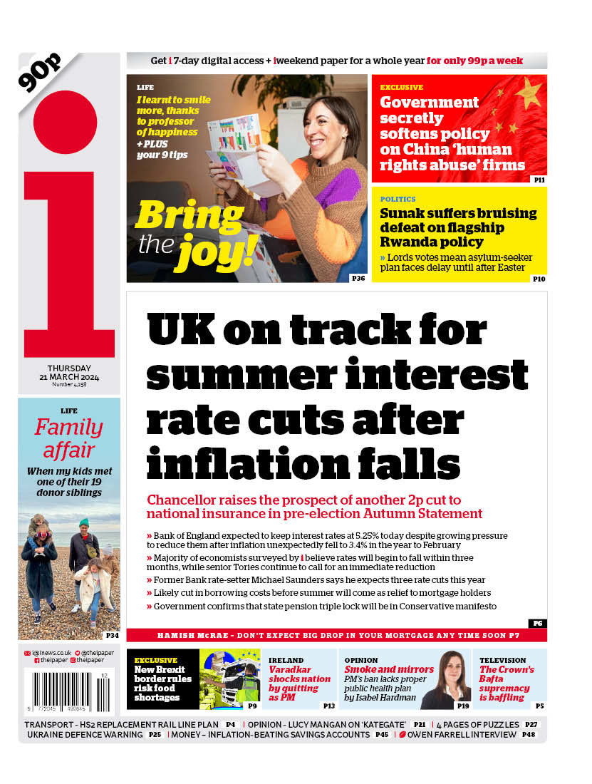 The i reports a potential summer interest rate cut and a 2p autumn national insurance reduction.
