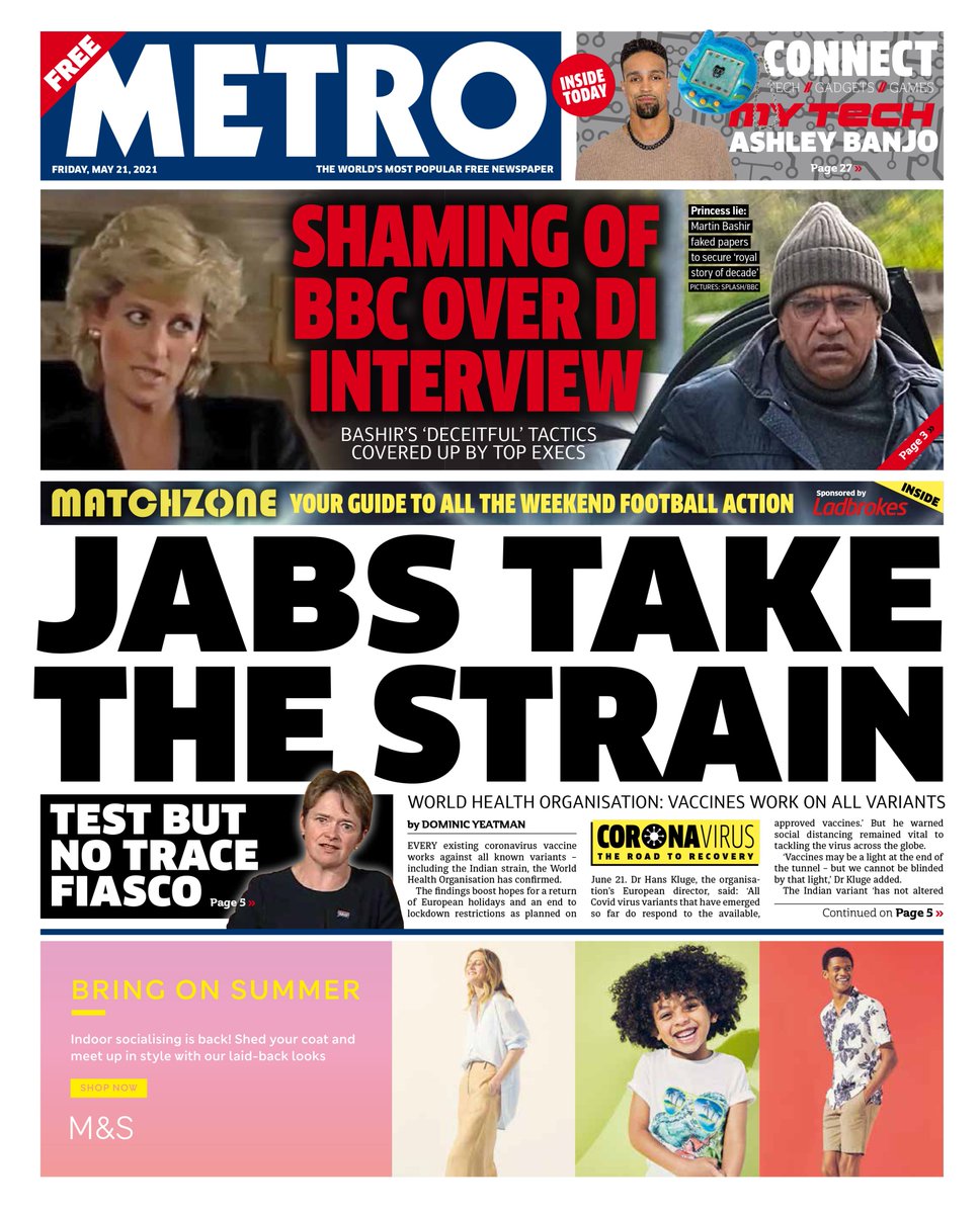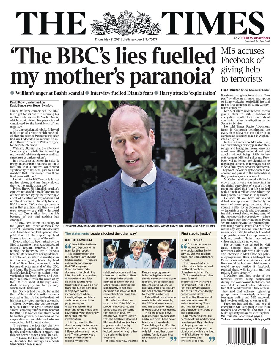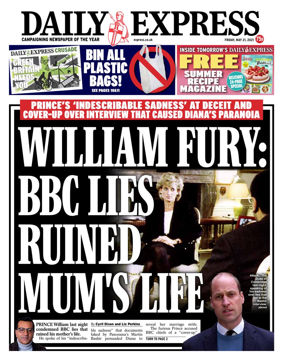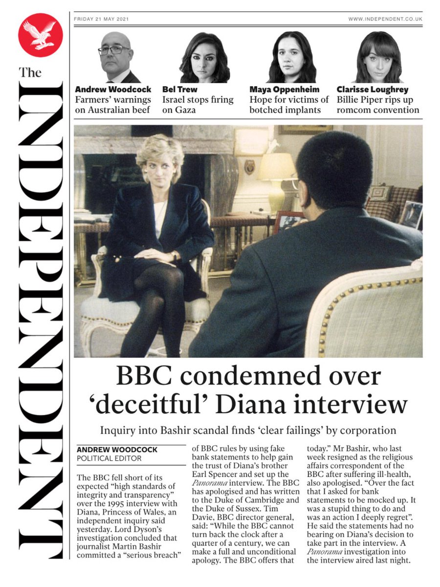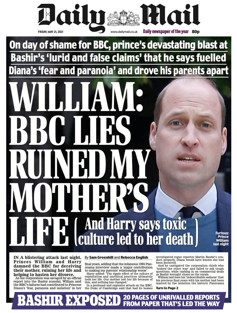 The “BBC’s lies destroyed our mum” says the front page of the Daily Mirror. Both Prince William and Prince Harry released statements following the publishing of the investigation into the Martin Bashir Panorama interview with their mum, Princess Diana.