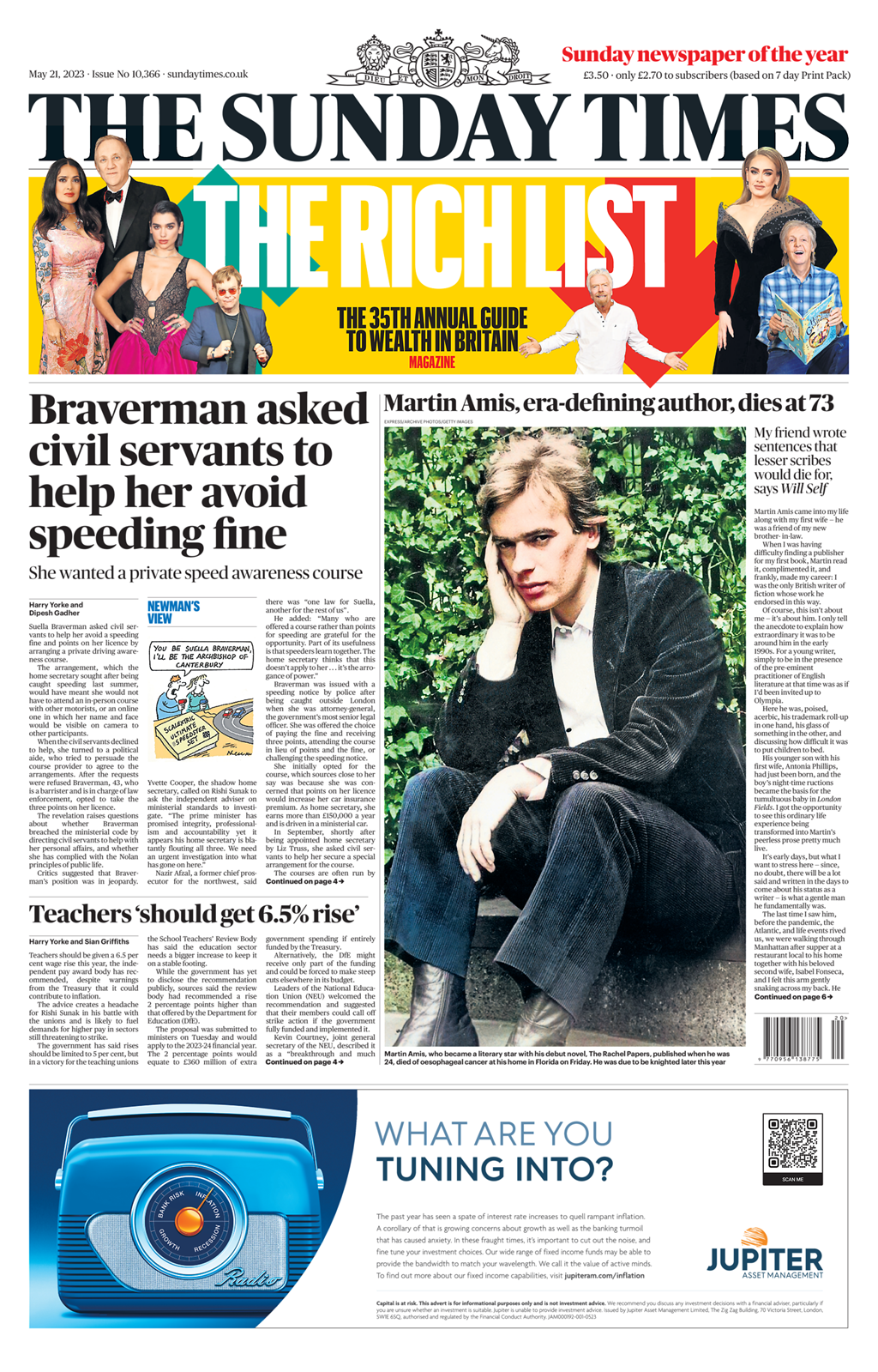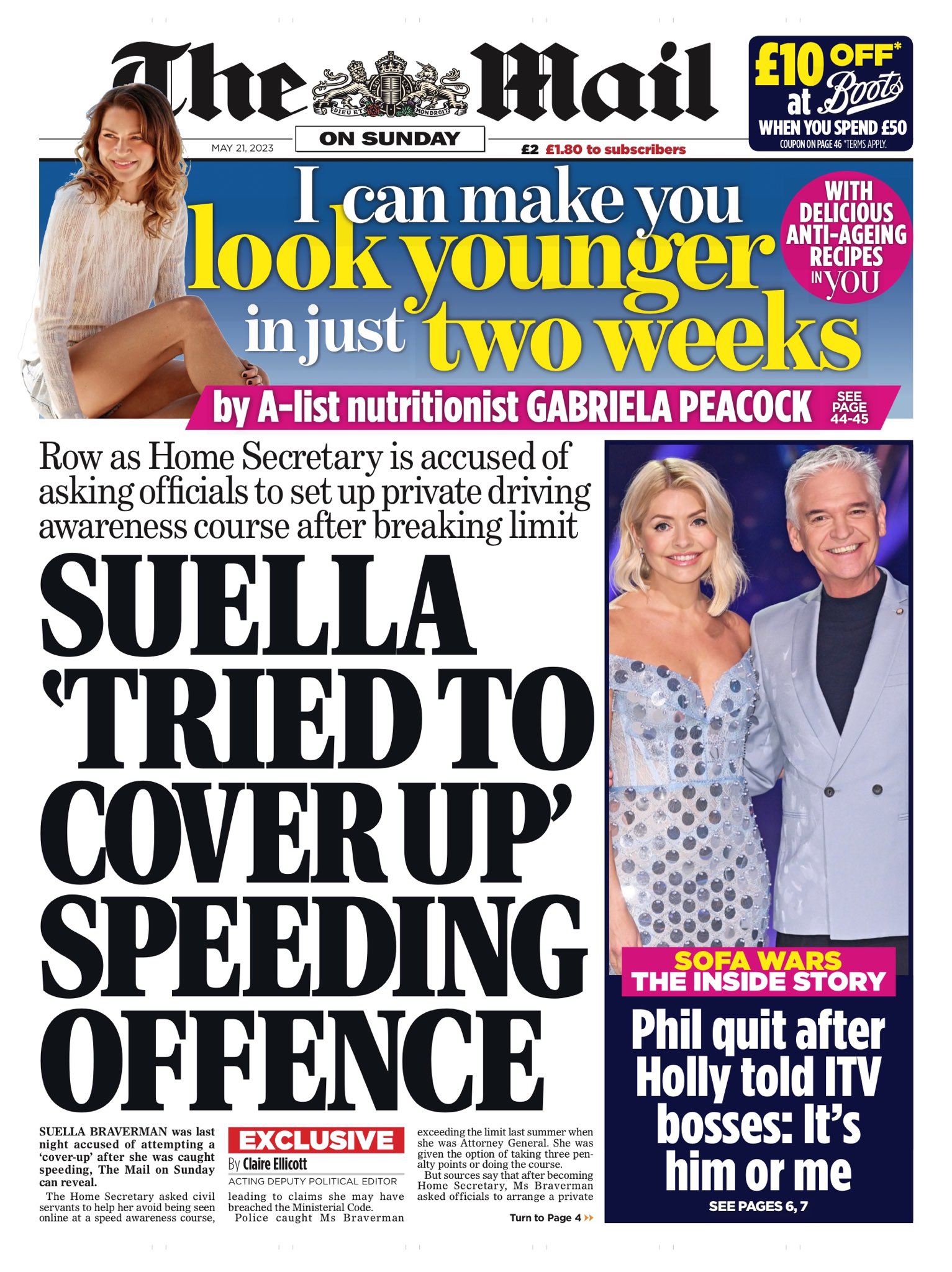 Allegations against Home Secretary Suella Braverman covering up a speeding incident make headlines in The Mail on Sunday.