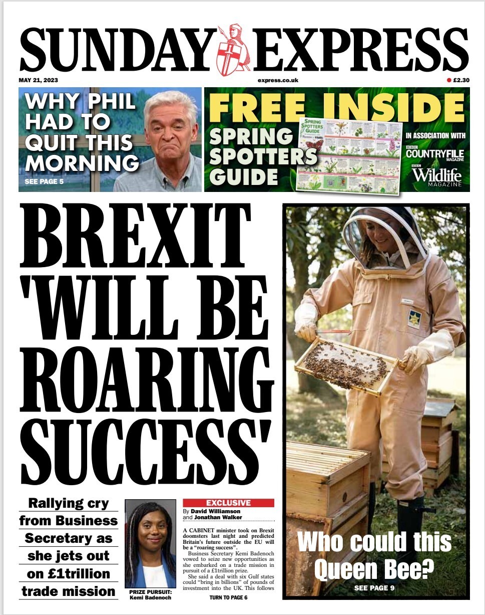 Business Secretary Kemi Badenoch’s comments on Brexit being a “roaring success” lead the Sunday Express.