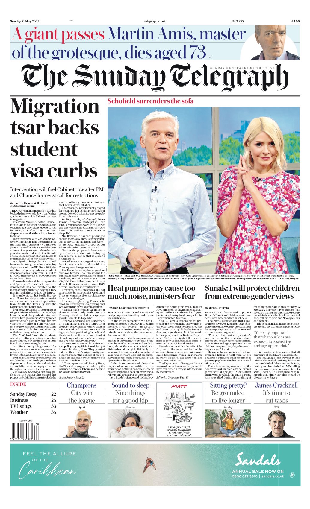 The Sunday Telegraph highlights government’s migration tsar backing a clampdown on foreign graduate visas.