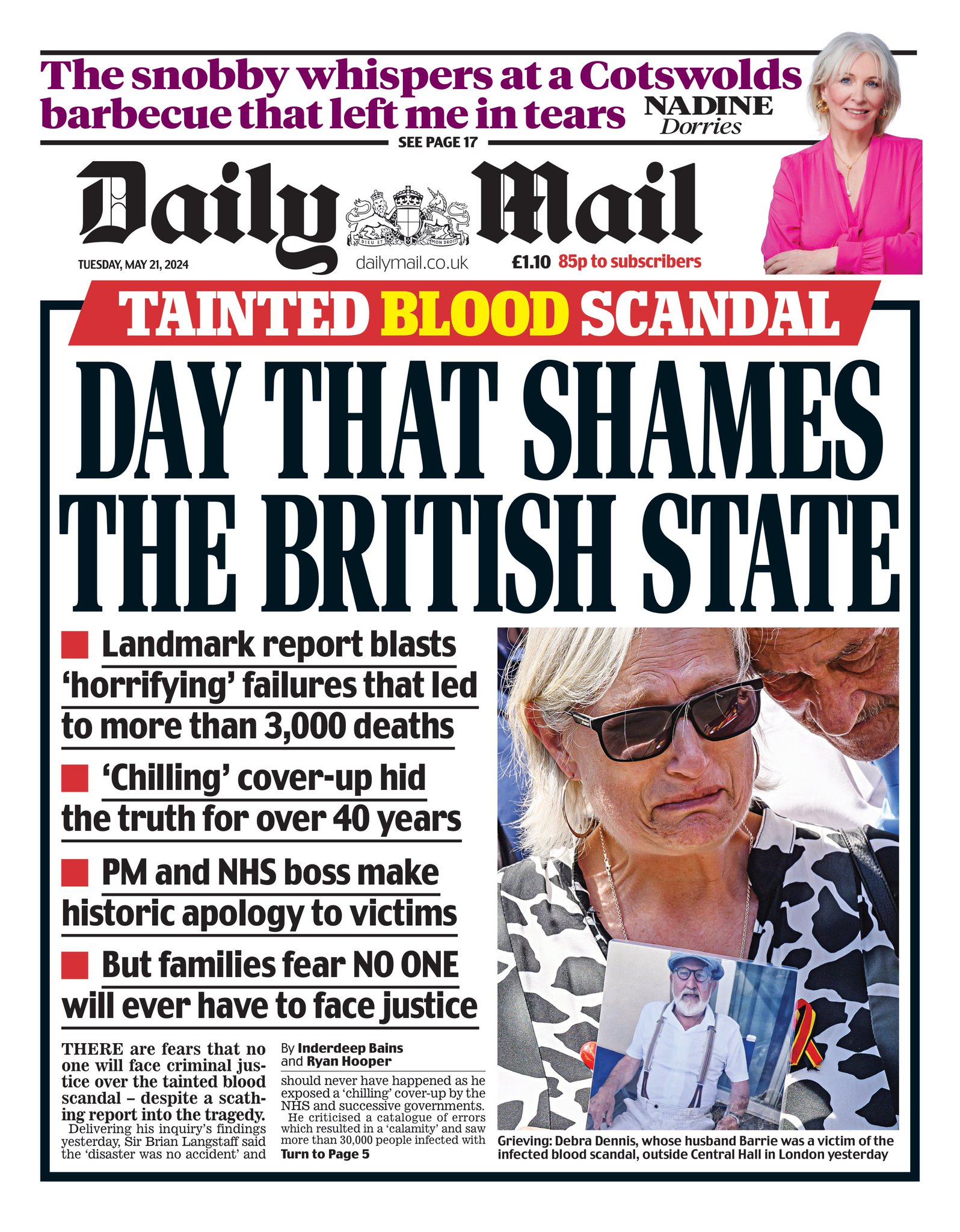 The Daily Mail leads with a shocking report on the infected blood scandal, attributing over 3,000 deaths to grave failures.