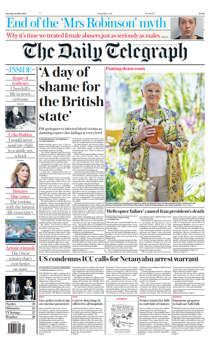 The Daily Telegraph leads with the prime minister’s comments on the infected blood scandal, dubbing it a “day of shame for the British state”.