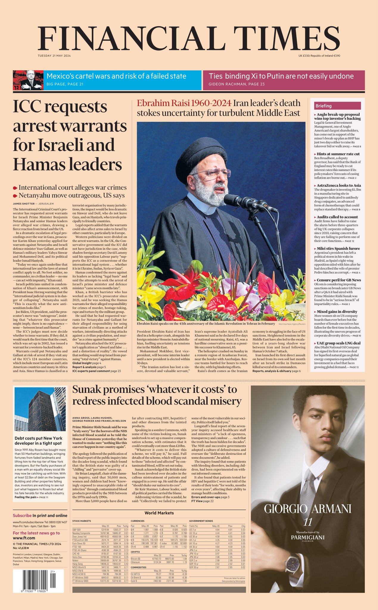 The Financial Times reports on the International Criminal Court’s call for arrest warrants against Israeli PM and senior Hamas leaders for alleged war crimes.
