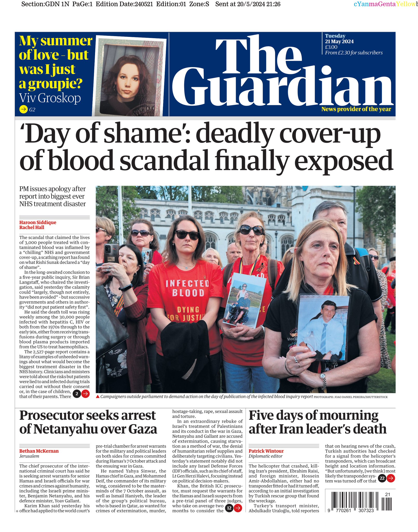The Guardian highlights the inquiry into the infected blood scandal, revealing that most deaths and infections could have been prevented.