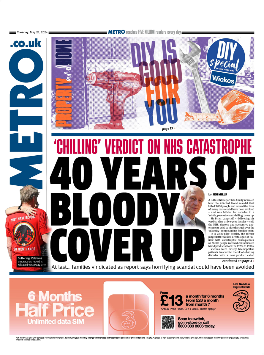 The Metro leads with a report on the infected blood scandal, revealing avoidable deaths and a chilling cover-up.