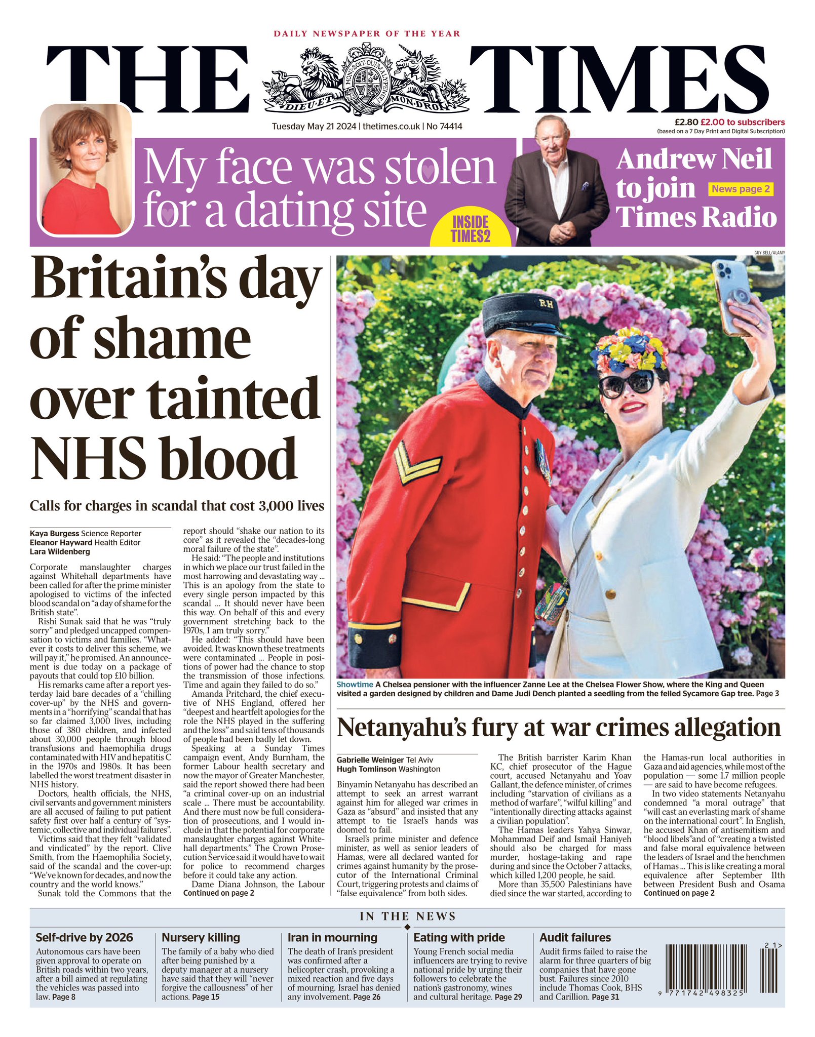 The Times highlights demands for corporate manslaughter charges against Whitehall departments due to the infected blood scandal.