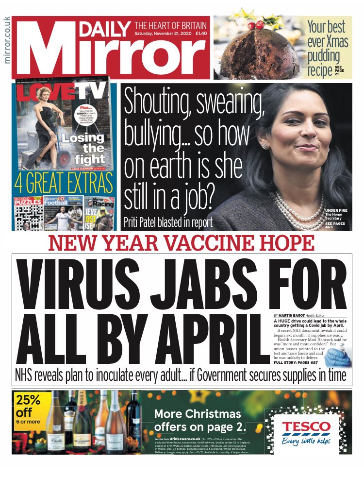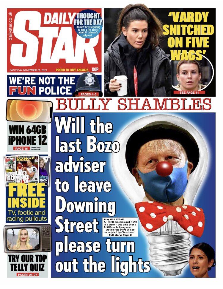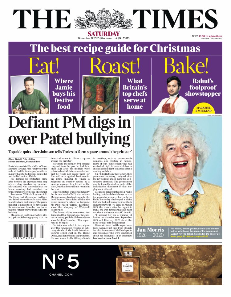 The Times says Boris Johnson has told Conservative MPs to “form a square” around Home Secretary Priti Patel, who he is standing by despite an inquiry finding her in breach of the ministerial code.