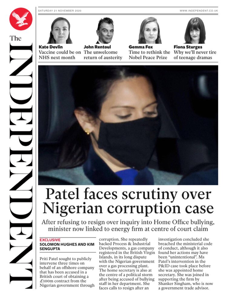 The Guardian says Boris Johnson has “ripped up the rulebook” by refusing to sack Home Secretary Priti Patel, despite an inquiry finding her in breach of the ministerial code.