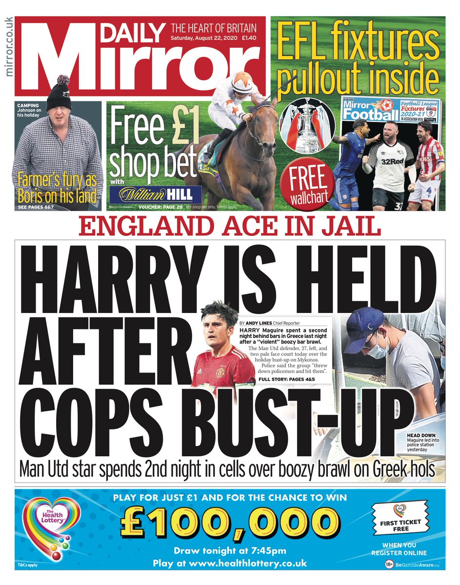 The Daily Mirror’s front page focuses on the arrest of Manchester United defender Harry Maguire in Greece.