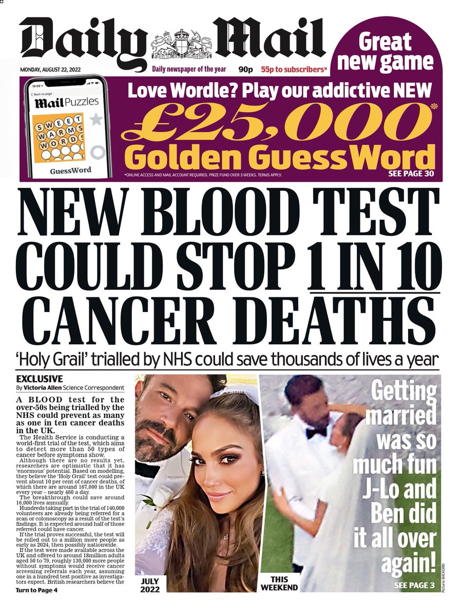It is reported in the Daily Mail that the NHS is testing a blood test for over-50s that may prevent one in 10 cancer deaths.