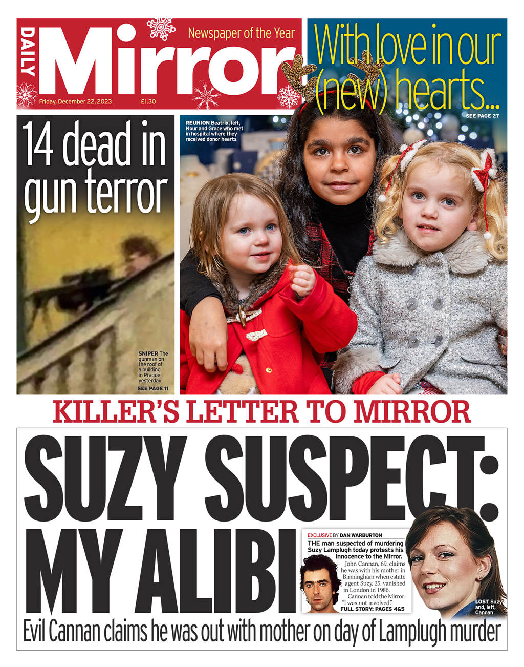 The Daily Mirror reports on the suspect in the 1986 Suzy Lamplugh case claiming he was in Birmingham at the time of her London disappearance.