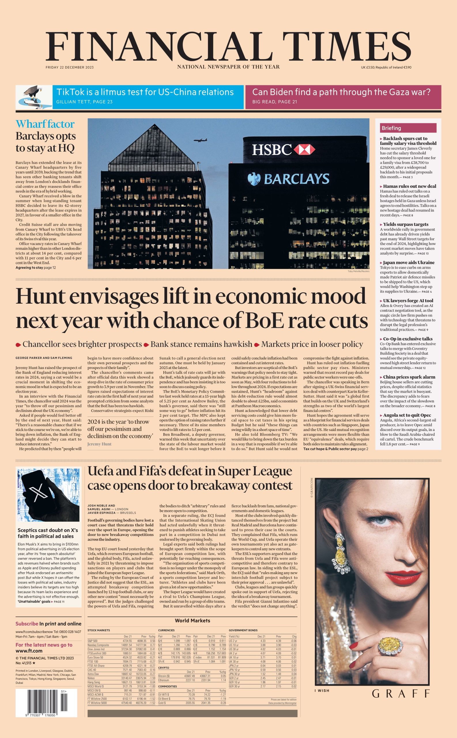 The Financial Times reports on the chancellor’s hint at a potential interest rate cut in 2024 to alter the economic climate.