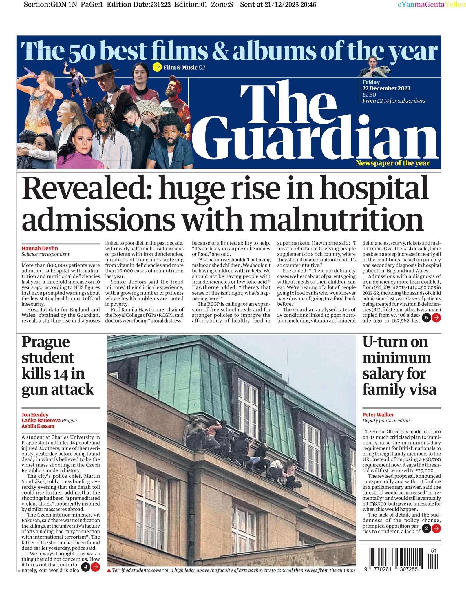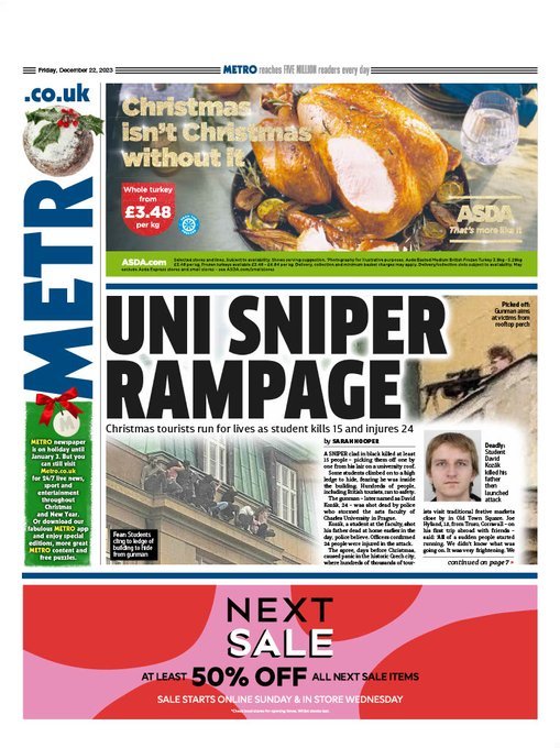 The Metro reports on a student’s shooting spree in Prague, resulting in 15 fatalities and numerous injuries.