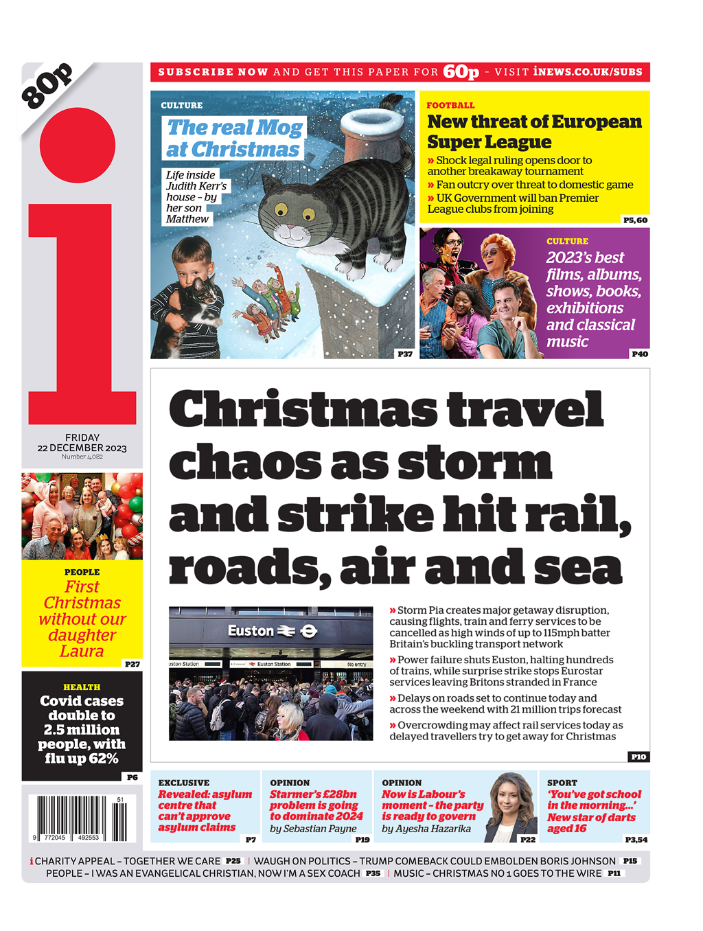 The i covers Thursday’s travel turmoil caused by a train strike and Storm Pia.