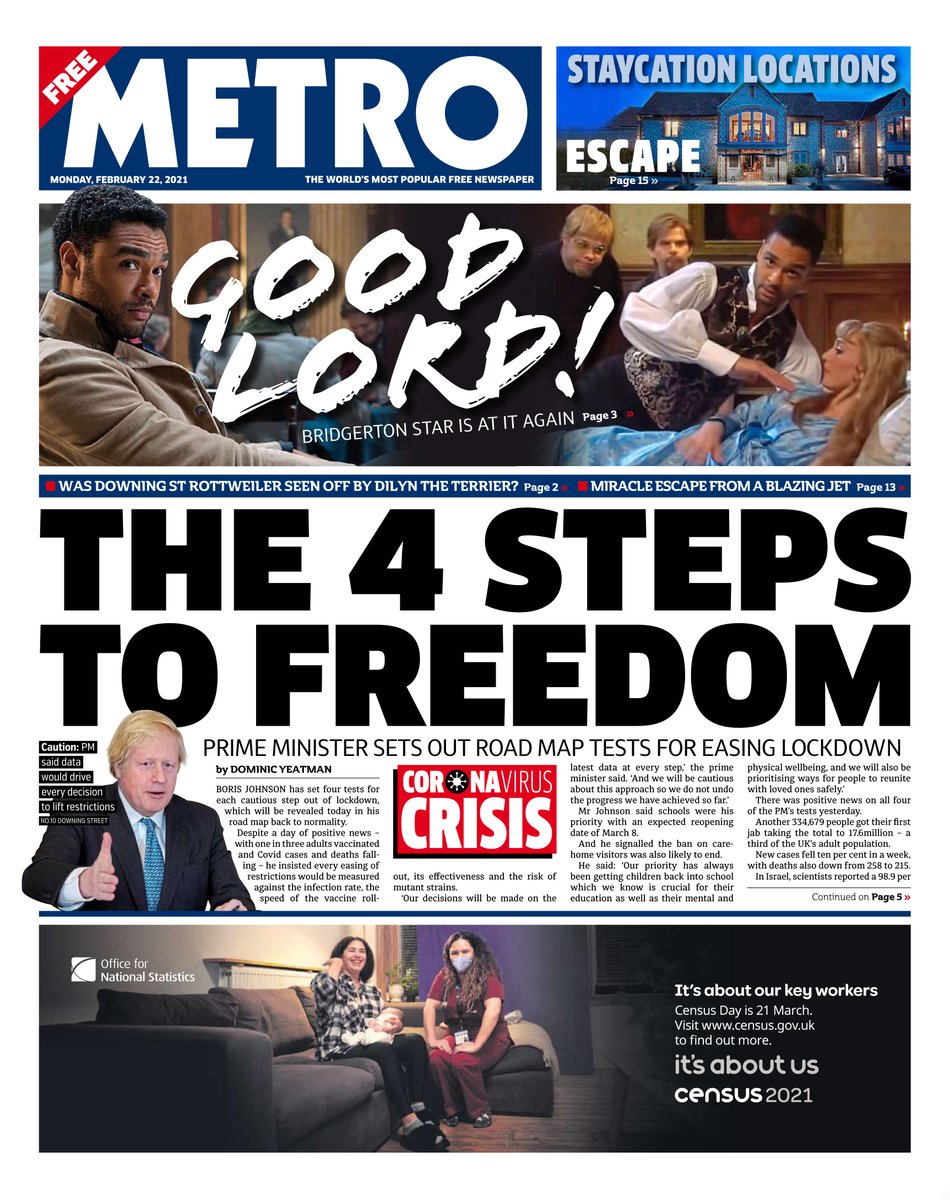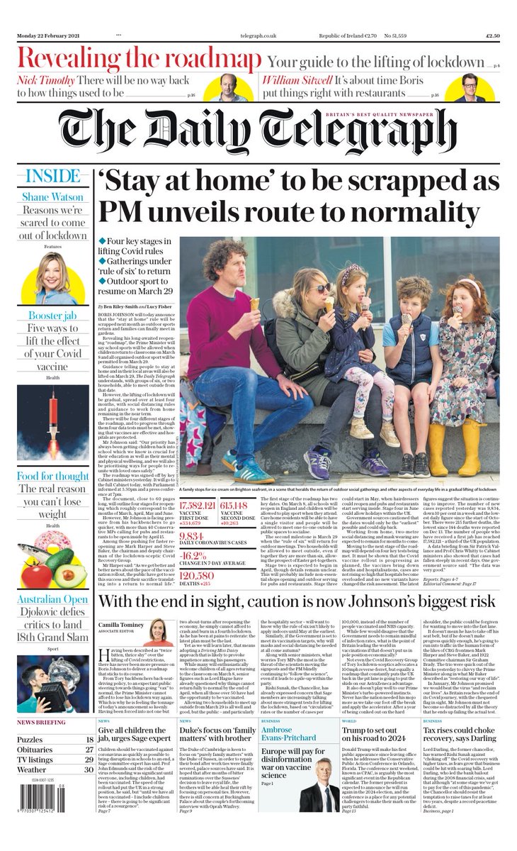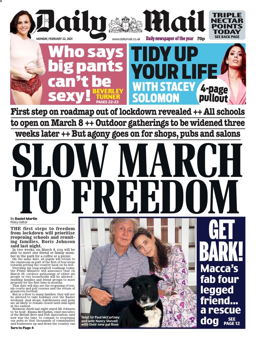 “Slow march to freedom” writes the Daily Mail, as it reveals that schools are set to reopen on 8 March and people will be allowed to have a picnic in the park with one friend from the same day. Read more on why this “slow march” will be a disappointment to many.