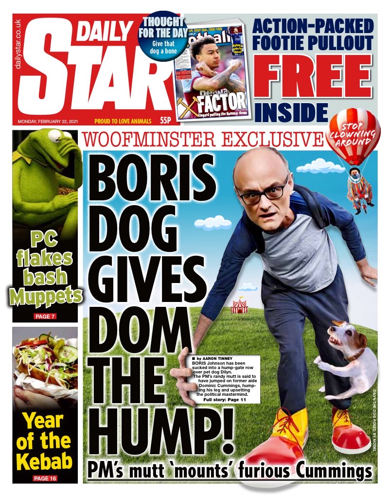 The Daily Star opts for a tongue-in-cheek cover story, saying the prime minister’s dog Dilyn upset his former aide Dominic Cummings by “humping his leg”.