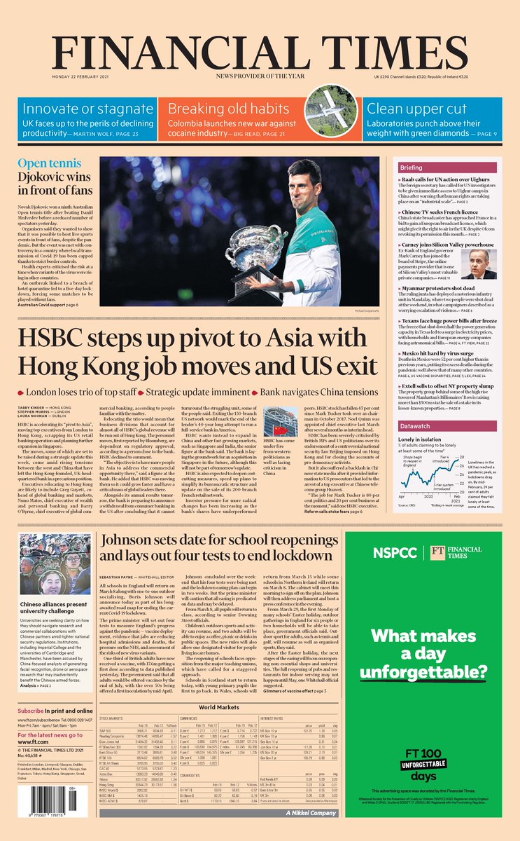 The Financial Times writes that HSBC is moving its top executives from London to Hong Kong as part of a “pivot to Asia”.