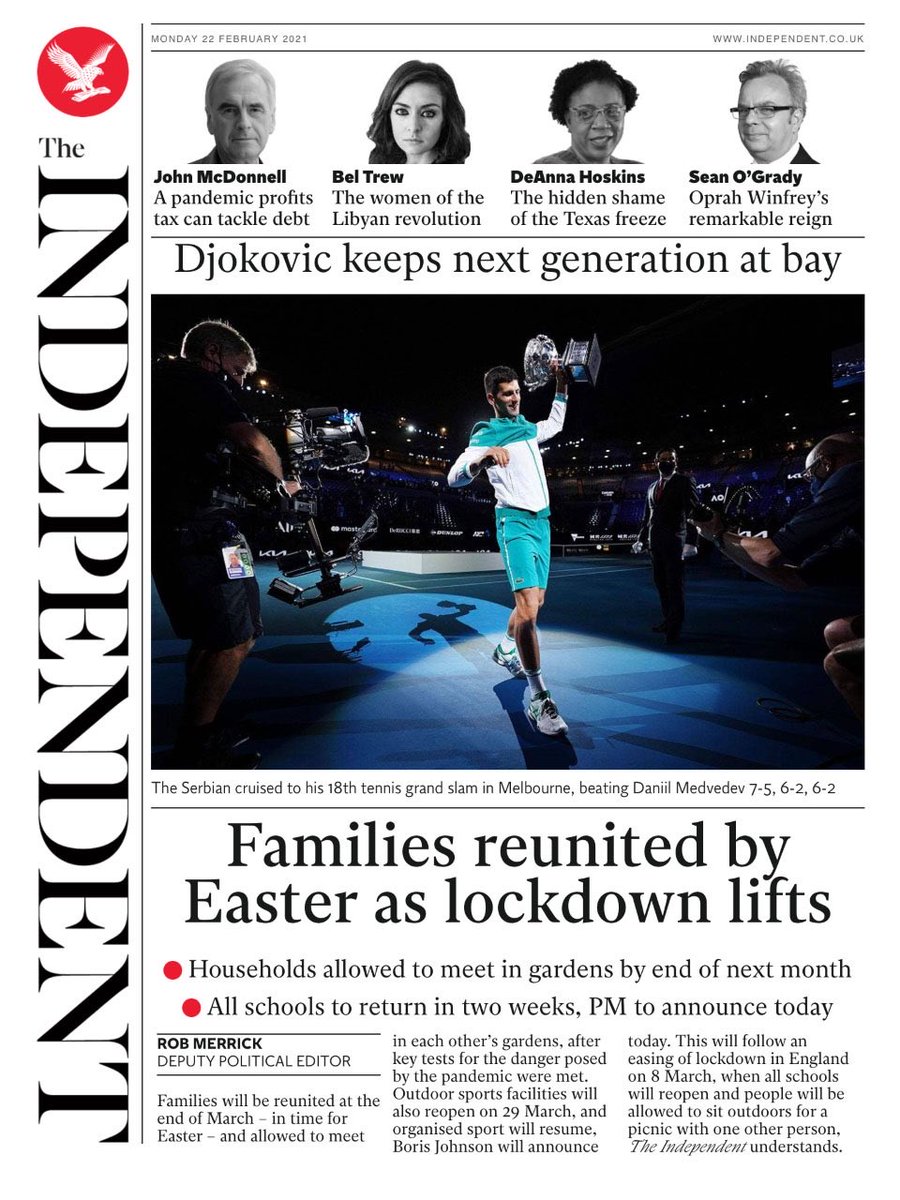 Also leading on Boris Johnson’s expected announcement on lockdown easing, The Independent says families will be able to meet in each other’s gardens by 29 March.You can read our story on the plan here.