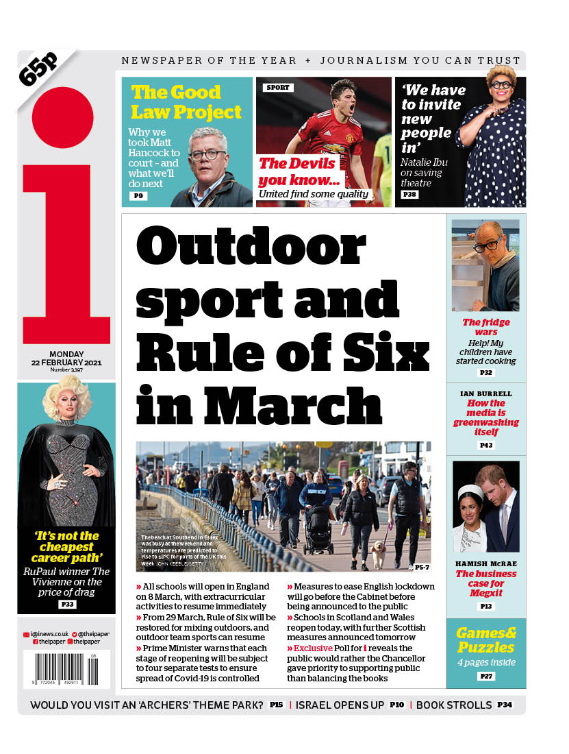 The i leads on the return of the rule of six in March, which is set to be announced by Boris Johnson on Monday when he reveals England’s roadmap out of lockdown. Get all the key dates on schools and outdoor sports here.