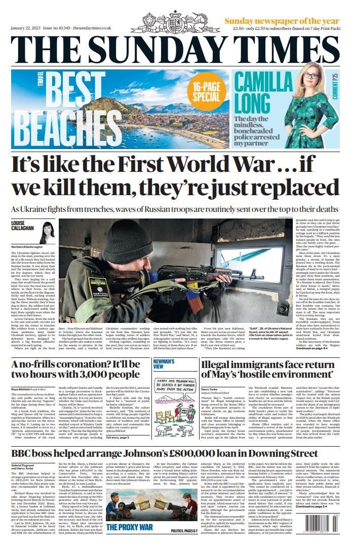 The Sunday Times leads with an article about life in the trenches for Ukrainian soldiers on the front lines.