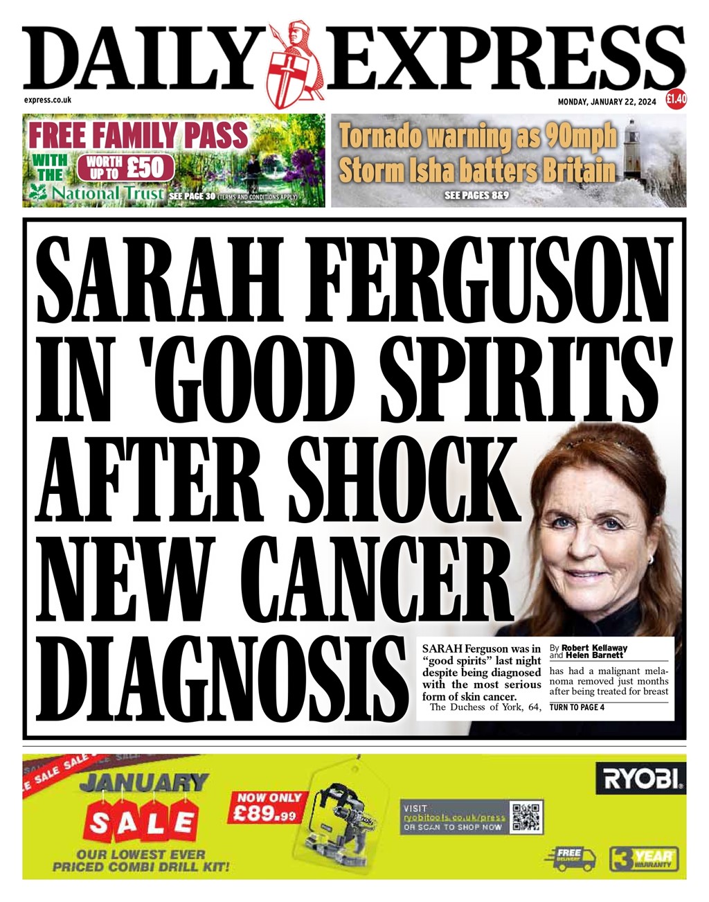 Despite a severe skin cancer diagnosis, Sarah Ferguson remains upbeat, reports the Daily Express.