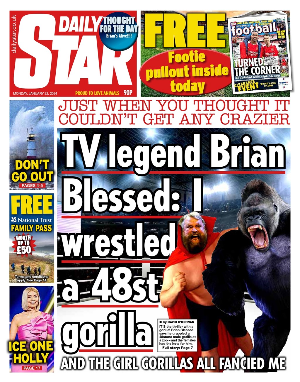 The Daily Star reports on TV icon Brian Blessed’s claim of wrestling a 48st gorilla.