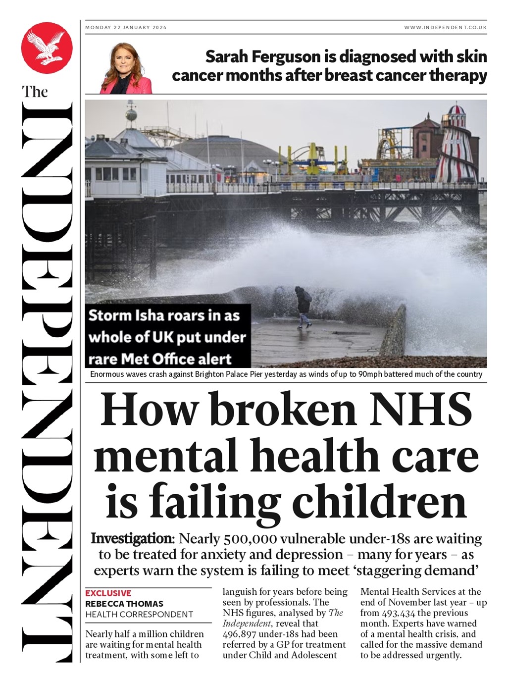 The Independent reports that nearly half a million vulnerable minors are awaiting NHS treatment for anxiety and depression.