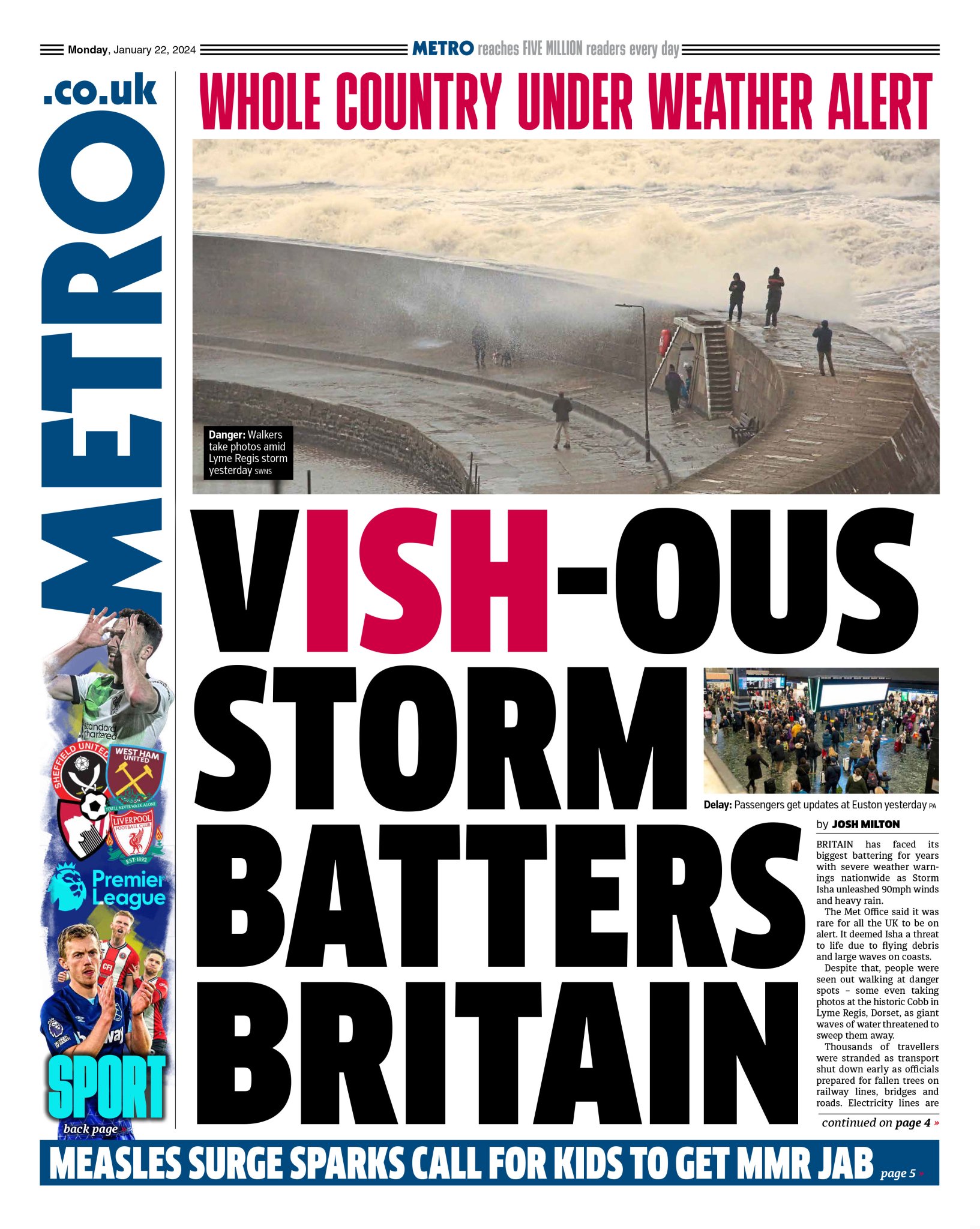 “Metro reports on Britain’s most severe weather onslaught in years, with nationwide warnings issued.