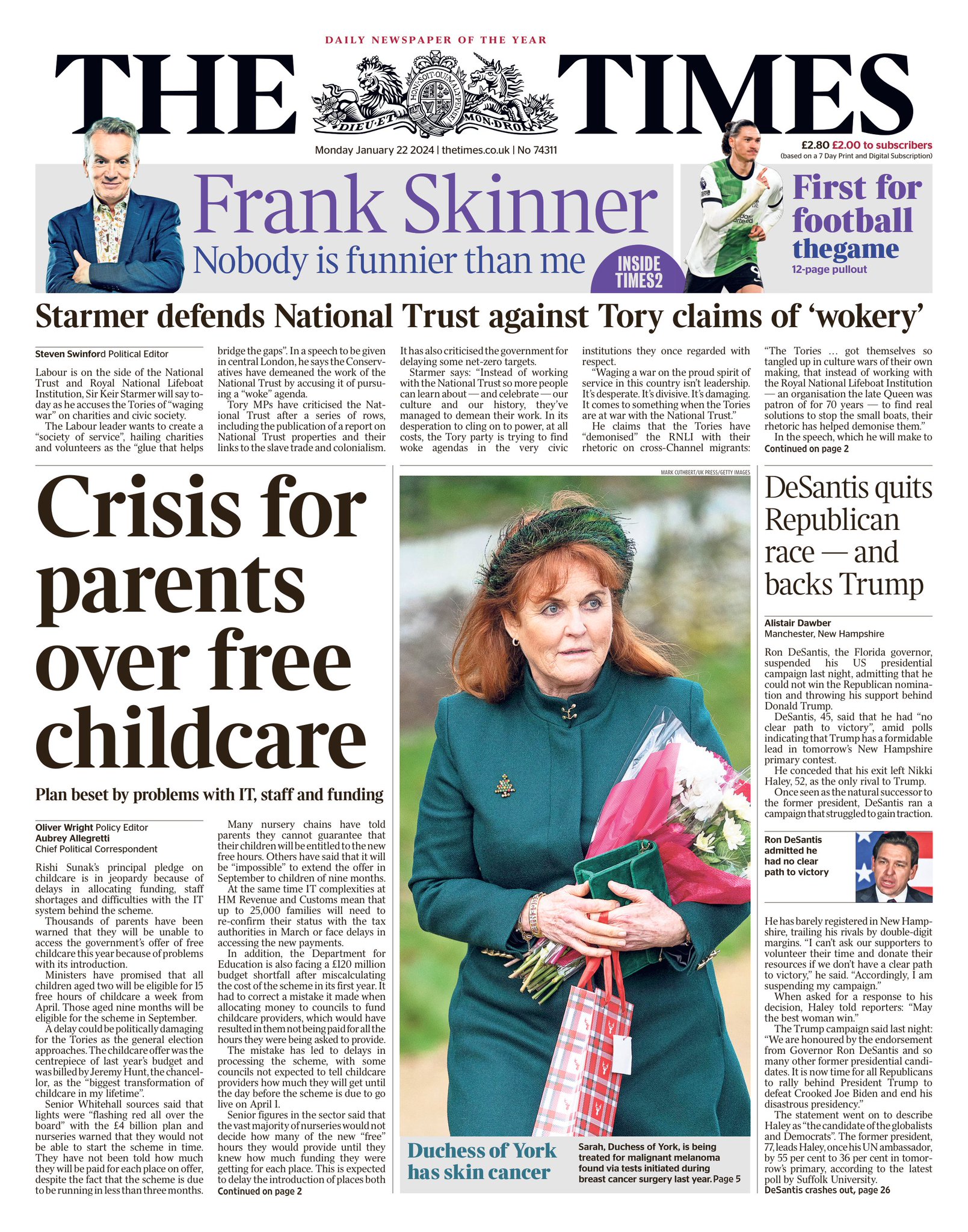 The Times reports on the potential failure of Rishi Sunak’s main childcare promise due to funding delays, staff shortages, and IT system issues.