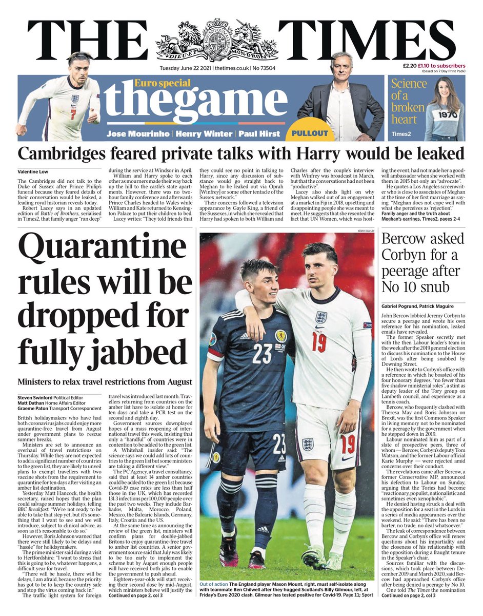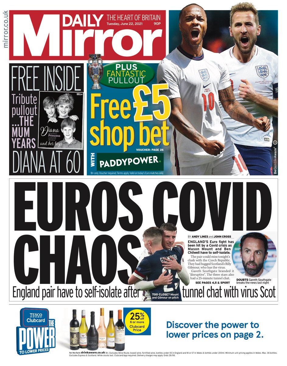 The Daily Mirror leads with the self-isolation of England’s Mason Mount and Ben Chilwell, saying they may miss Tuesday’s game against Czech Republic.
