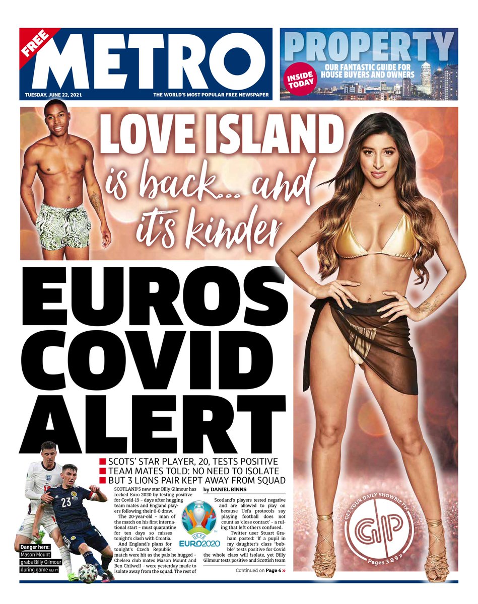 Metro leads with the isolation of two England players, Ben Chilwell and Mason Mount, after they came into contact with Scotland’s Billy Gilmour, who has tested positive for COVID-19.