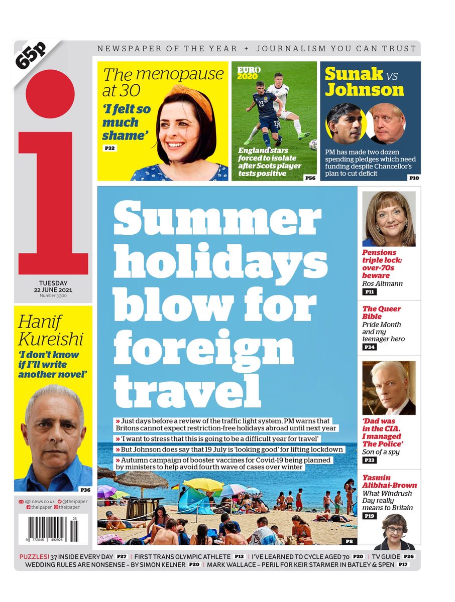 The i says Boris Johnson has warned that Britons cannot expect restriction-free holidays abroad until next year.
