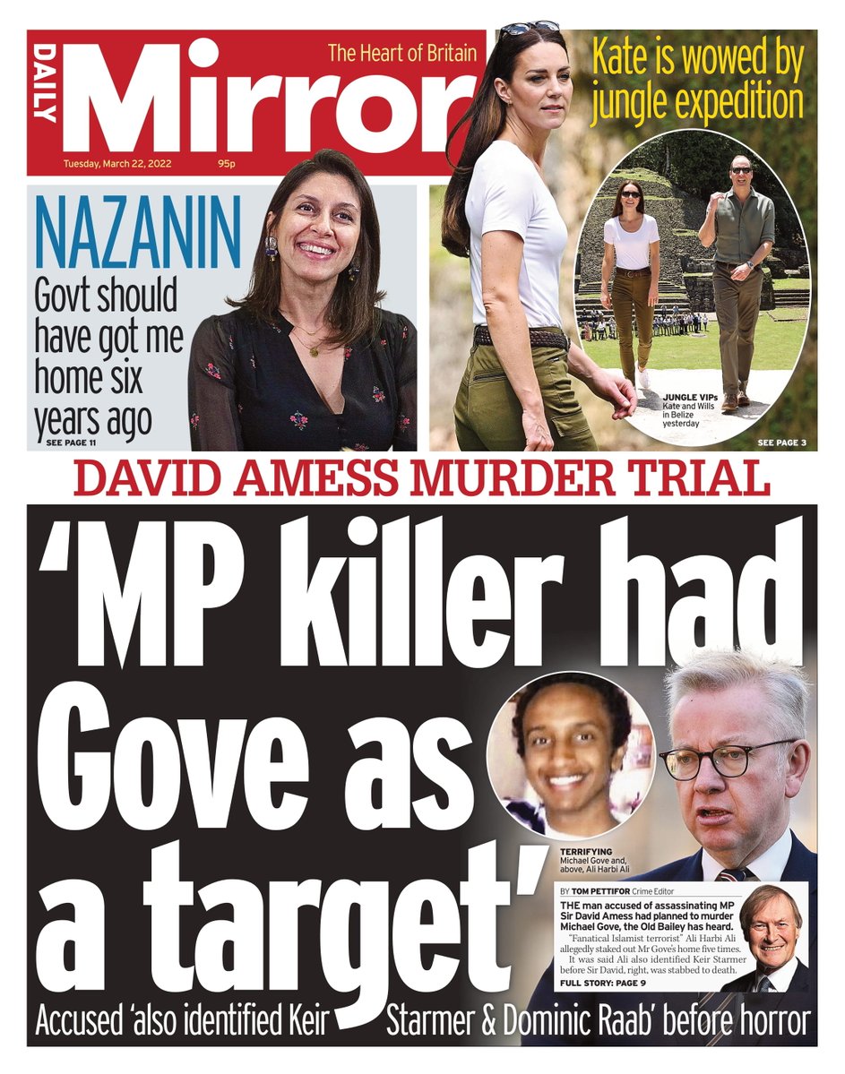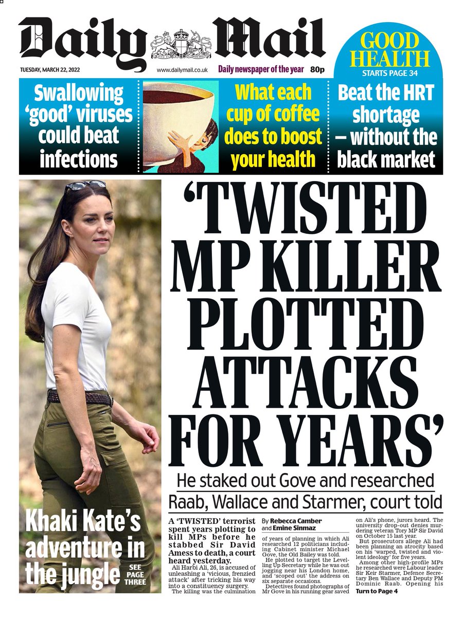 The Daily Mail leads with the trial of a man accused of killing Conservative MP Sir David Amess. Ali Harbi Ali, who denies the charges against him, spent years plotting to kill politicians, the Old Bailey has heard.