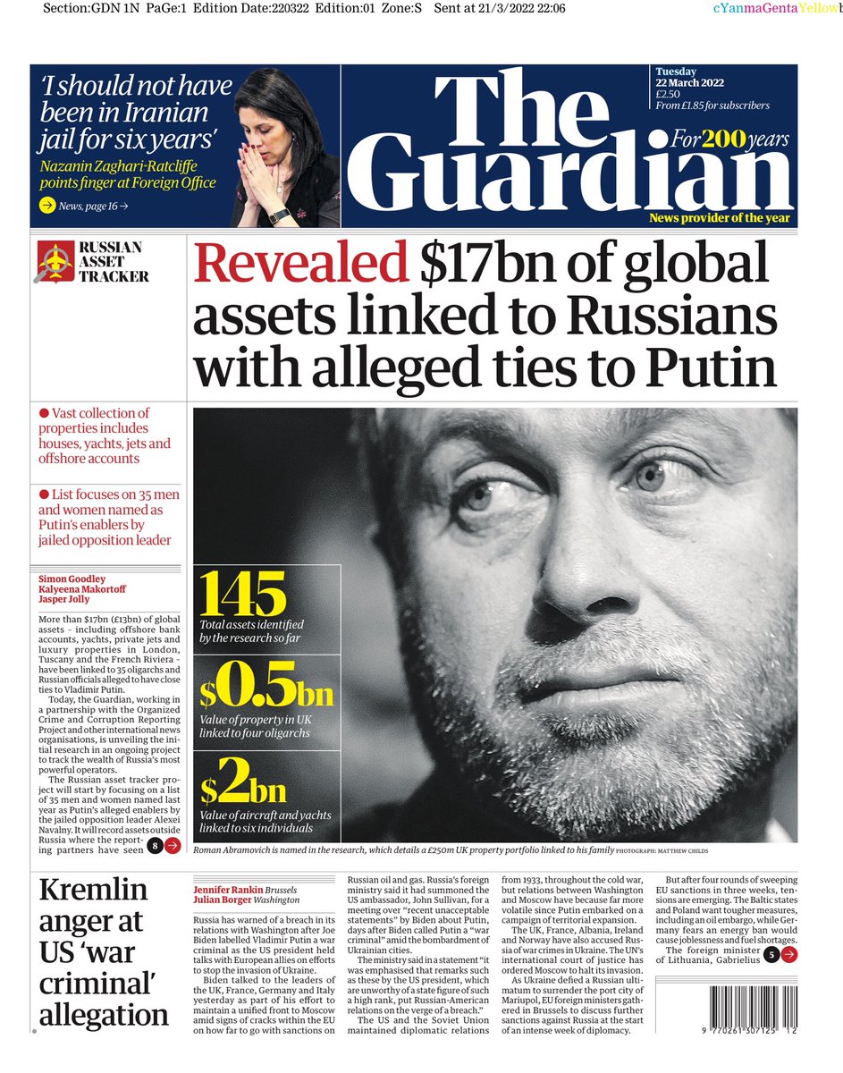 The Guardian says an investigation has linked more than £13bn of global assets, including offshore bank accounts, yachts, private jets and luxury properties in London, Tuscany and the French Riviera, to 35 oligarchs and Russian officials alleged to have close ties to Vladimir Putin.