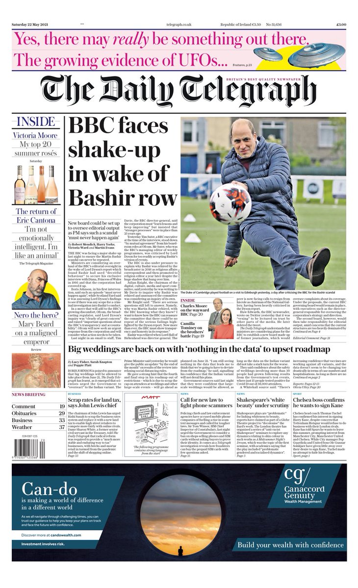 A major shake-up is being planned at the BBC, The Daily Telegraph says, after the revelations about Martin Bashir’s interview with Princess Diana. More on that story here.