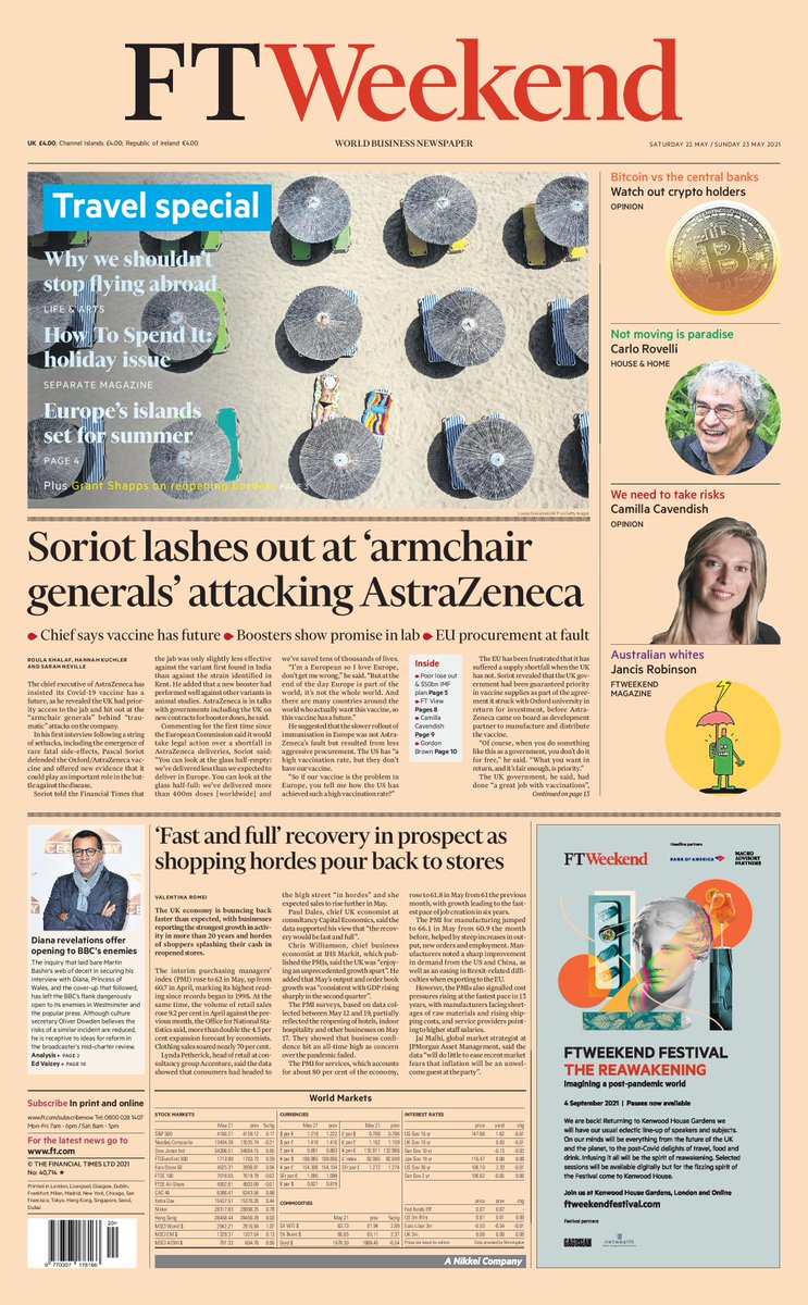 The Financial Times leads on the head of AstraZeneca’s response to attacks on the company’s COVID-19 vaccine.
