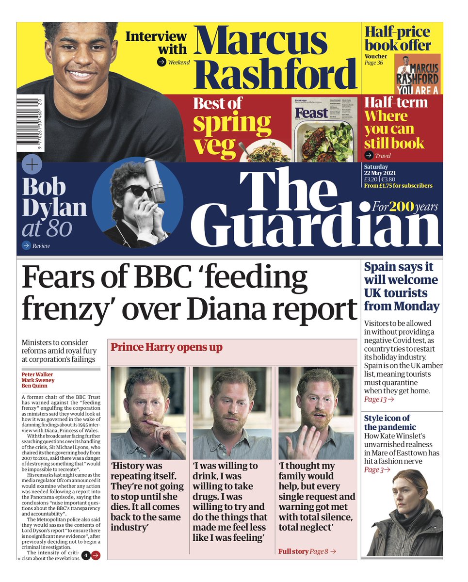 The Guardian leads on the BBC’s future in the wake of the scandal over Martin Bashir’s interview with Princess Diana in 1995.