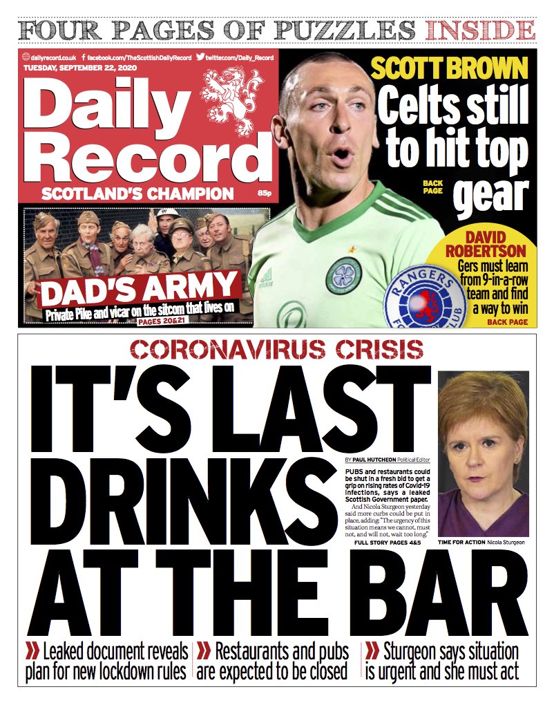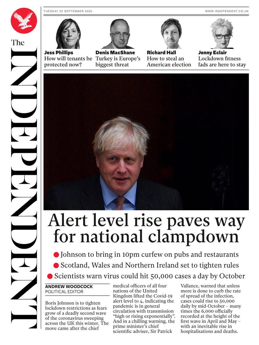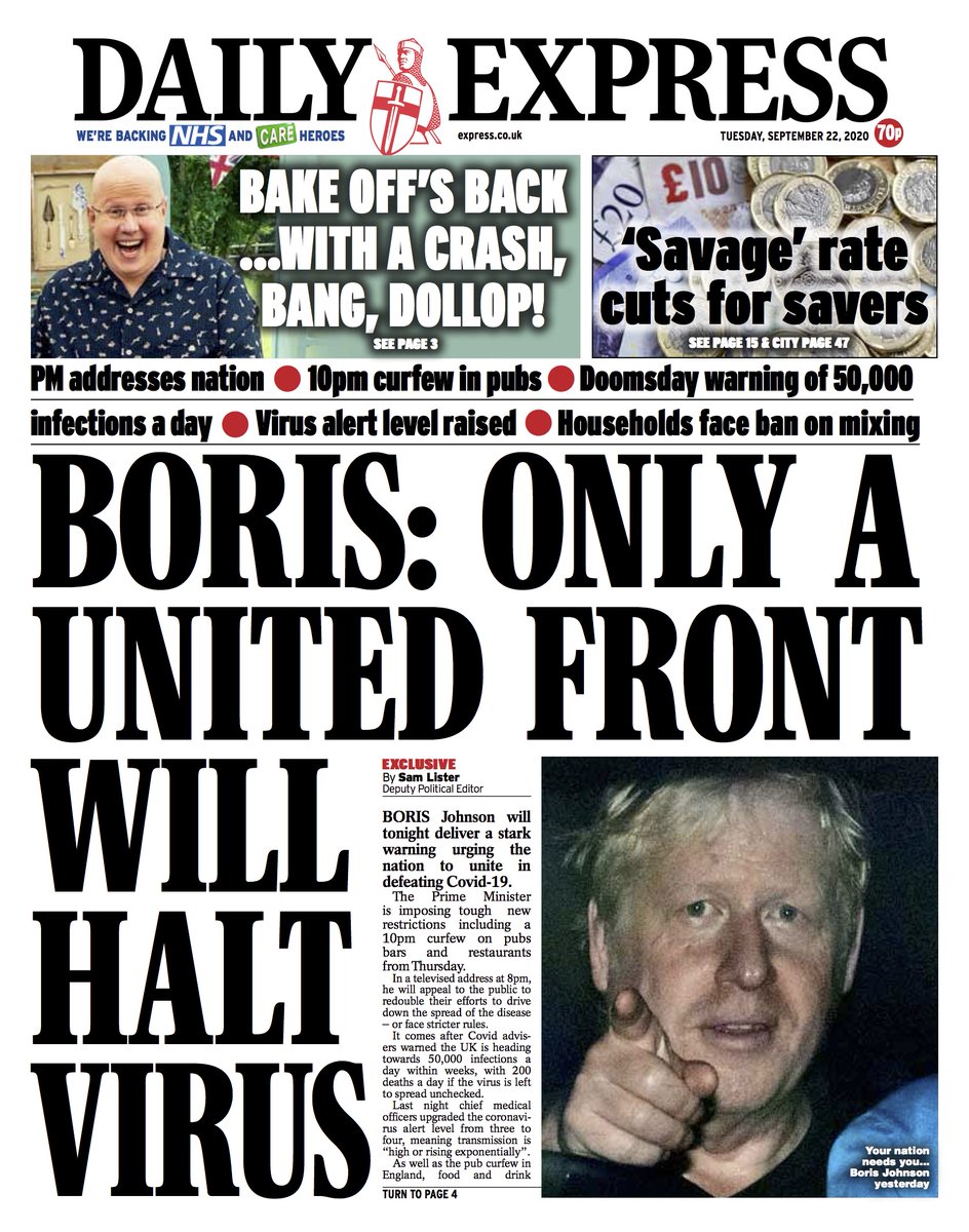 The Daily Express leads with Boris Johnson announcing new coronavirus restrictions on Tuesday, adding that chief medical officers upgraded the COVID-19 alert level from three to four.