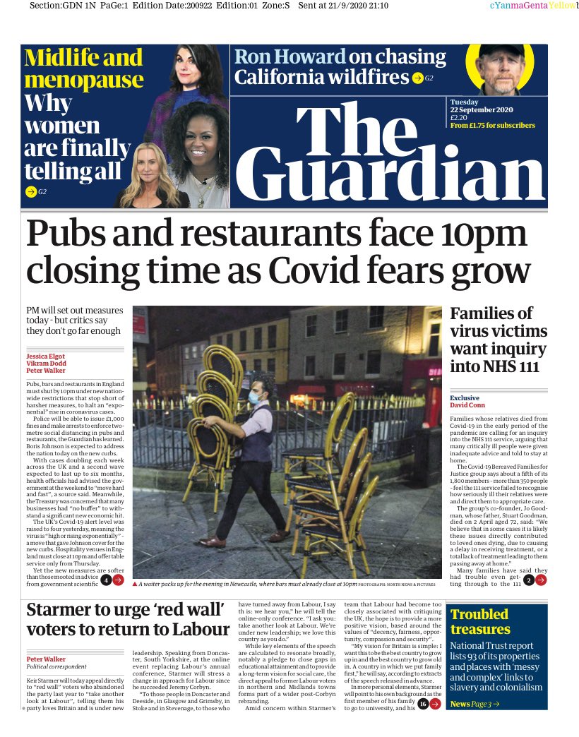 Pubs, bars and restaurants in England must shut by 10pm under new nationwide restrictions that stop short of harsher measures, to halt an “exponential” rise in coronavirus cases, The Guardian writes.