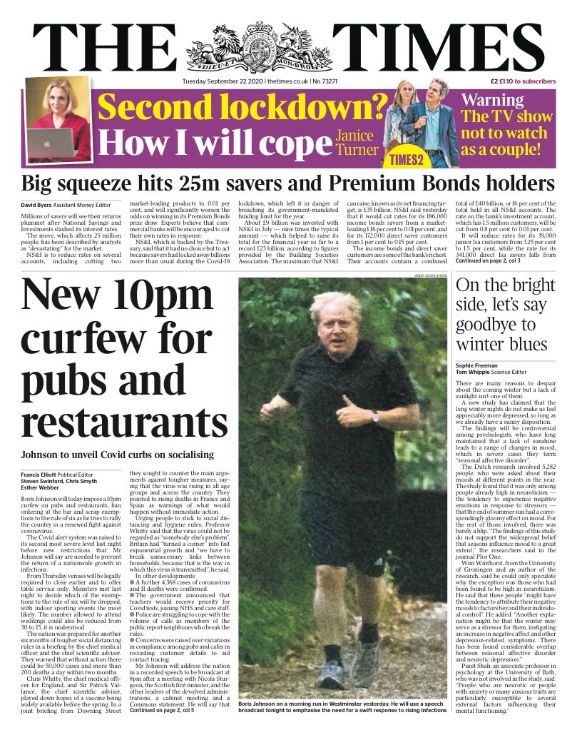 The Daily Telegraph reports that Boris Johnson will announce national coronavirus restrictions including early pub closing and a return to working from home as he starts to reverse the freedoms of recent months.