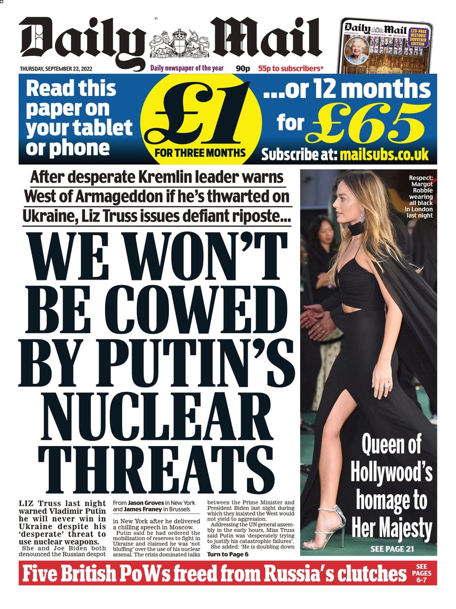 Defiant Liz Truss responds to Vladimir Putin’s nuclear threat, reports the Daily Mail.