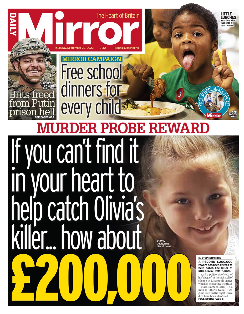 The Daily Mirror leads with a record reward for finding Olivia Pratt-Korbel’s killer.