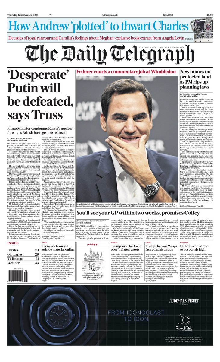 According to the Daily Telegraph, Liz Truss vows to defeat a ‘desperate’ Vladimir Putin.