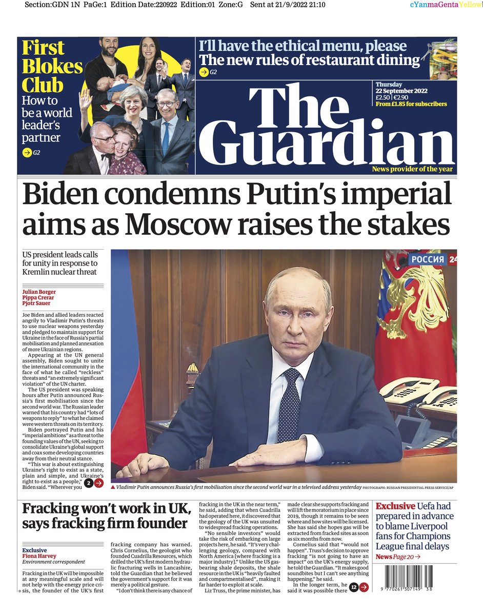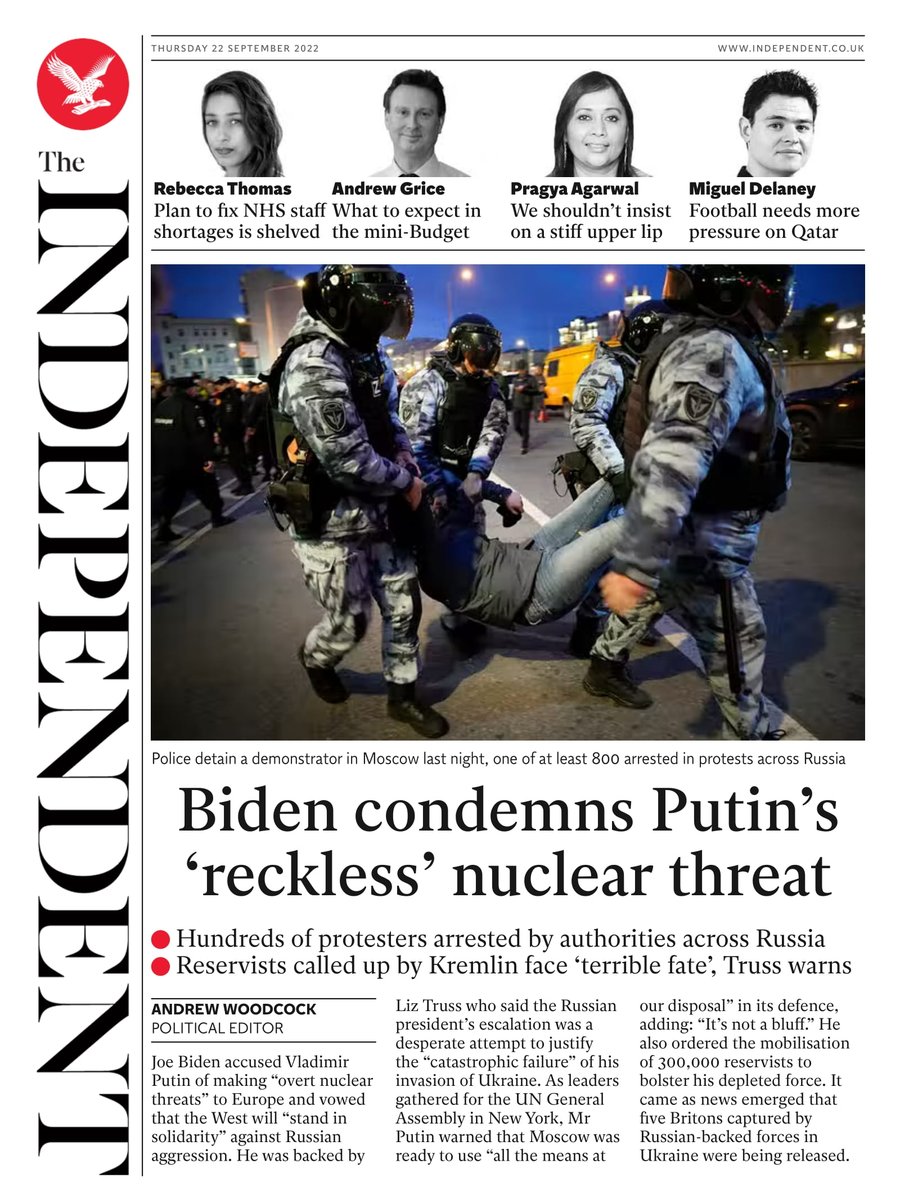The Times opens with the US president condemning Vladimir Putin’s nuclear threat.