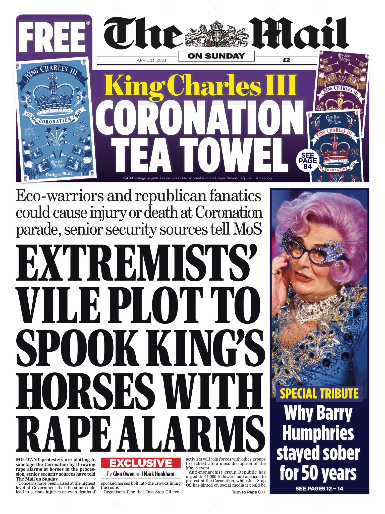 Mail on Sunday reports an alleged plot by environmentalists and republicans to frighten King’s horses at coronation using rape alarms.
